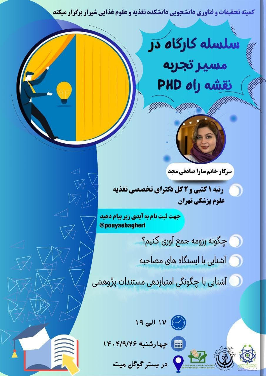 به مناسبت هفته پژوهش، کمیته تحقیقات و فناوری دانشجویی دانشکده بهداشت دانشگاه علوم پزشکی شیراز ، با همکاری کمیته تحقیقات و فناوری دانشجویی دانشکده بهداشت دانشگاه علوم پزشکی همدان برگزار میکند: