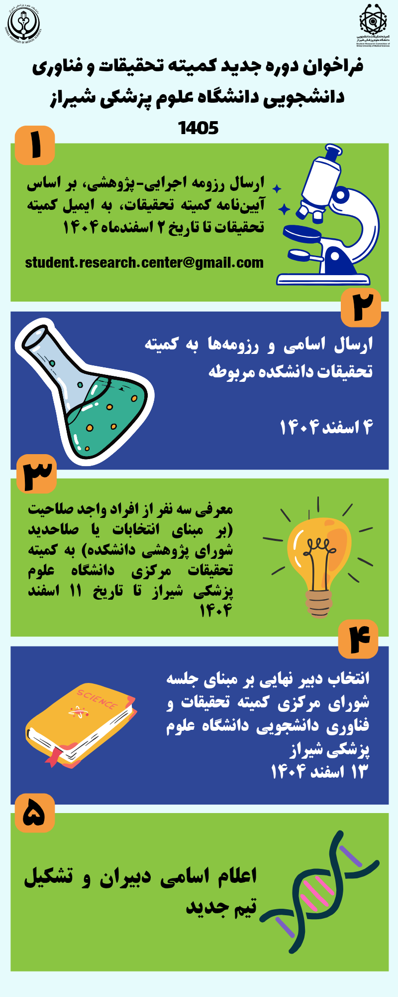 اخبار فراخوان جذب دبیران جدید کمیته تحقیقات و فناوری دانشجویی دانشگاه علوم پزشکی شیراز