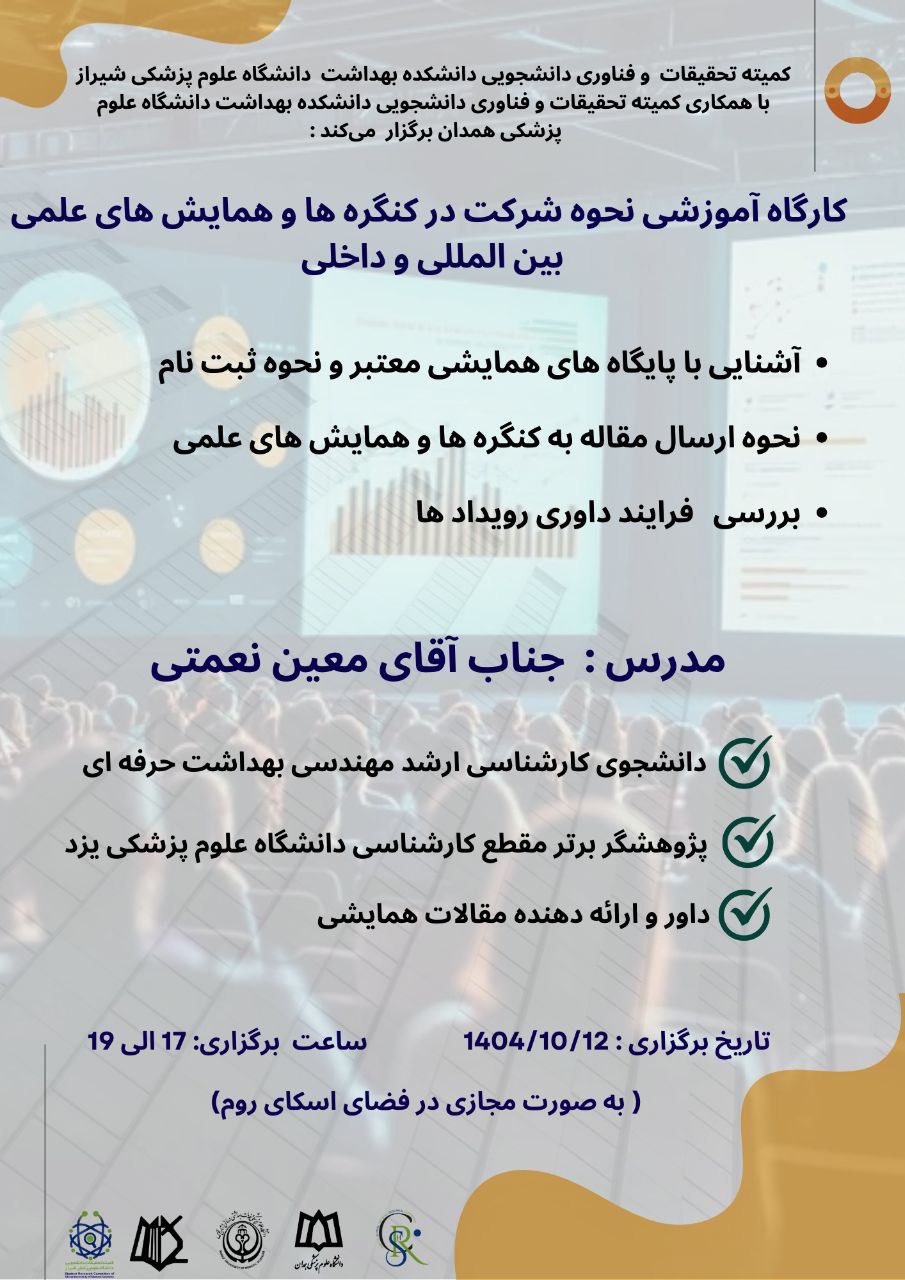 کمیته تحقیقات و فناوری دانشجویی دانشکده بهداشت دانشگاه علوم پزشکی شیراز با همکاری کمیته تحقیقات و فناوری دانشجویی دانشکده بهداشت دانشگاه علوم پزشکی همدان برگزار میکند: