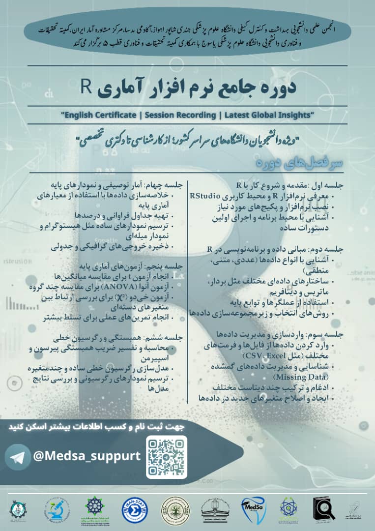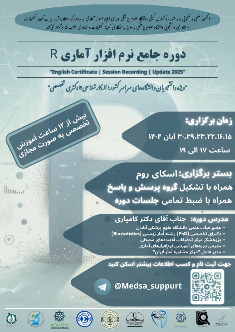 انجمن علمی دانشجویی بهداشت و کنترل کیفی دانشگاه علوم پزشکی جندیشاپور اهواز، آکادمی مدسا، مرکز مشاوره آمار ایران، کمیته تحقیقات و فناوری دانشجویی دانشگاه علوم پزشکی یاسوج با همکاری کمیته تحقیقات و فناوری دانشجویی قطب ۵ برگزار میکند: