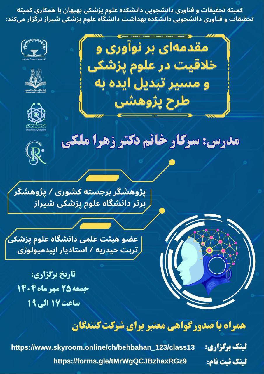 کمیته تحقیقات و فناوری دانشجویی دانشکده علوم پزشکی بهبهان با همکاری کمیتههای تحقیقات و فناوری دانشجویی دانشکده بهداشت دانشگاه علوم پزشکی شیراز برگزار میکند: