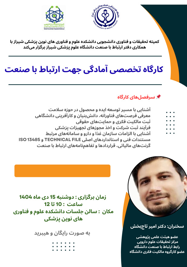 کمیته تحقیقات و فناوری دانشجویی دانشکده علوم و فناوری های نوین پزشکی شیراز با همکاری دفتر ارتباط با صنعت دانشگاه علوم پزشکی شیراز برگزار میکند:
